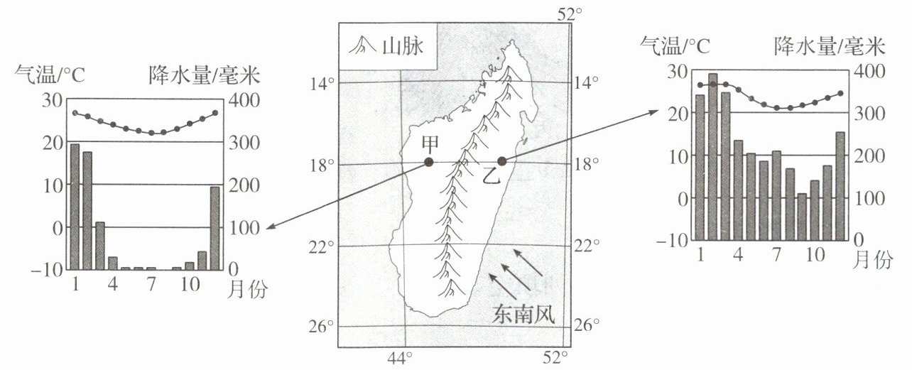 摄像师在航拍某岛时发现甲地树木稀疏,乙地森林茂密。下图为该岛甲、乙两地位置及气候示意简图,据此完成下列各题。