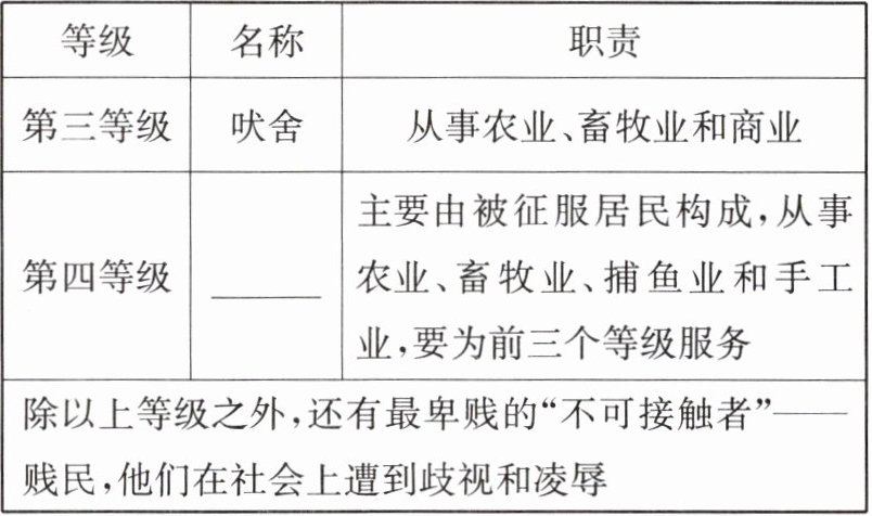 |第四等级|______|主要由被征服居民构成,从事农业、畜牧业、捕鱼业和手工业,要为前三个等级服务|