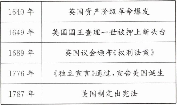 (2)英国颁布了《权利法案》;美国颁布1787年宪法。英国确立了君主立宪制;美国实行联邦制共和政体。