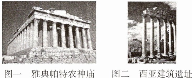 (1)古希腊文化。 (2)图一的建筑影响了图二的建筑风格,图二建筑风格吸收了图一建筑风格的特点并有所创新。
