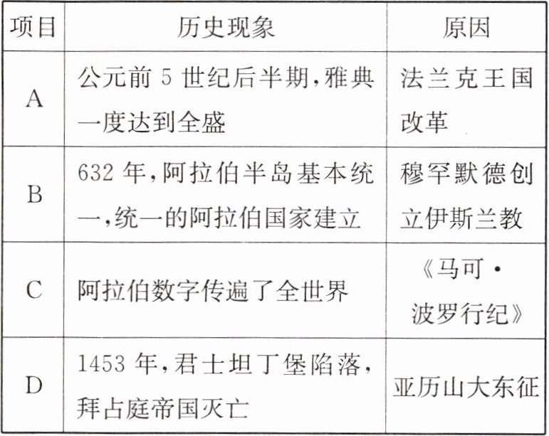 - 4.(山东东营中考改编)下列表格中,历史现象与原因的对应关系正确的是( )