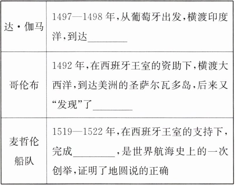 | 达·伽马 | 1497—1498年,从葡萄牙出发,横渡印度洋,到达______ |