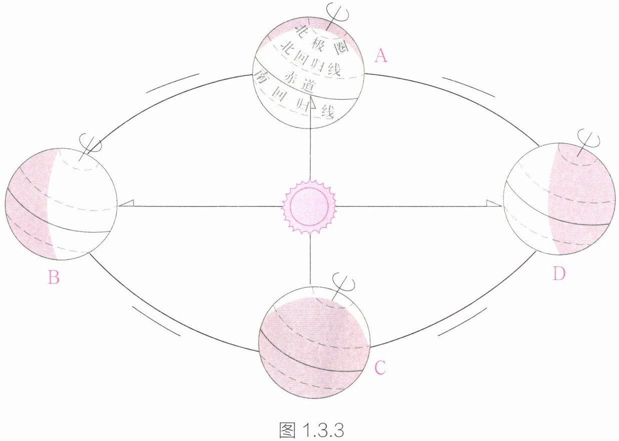 (1) 在图 1.3.3 中画出地球自转和公转的方向,并在 A、B、C、D 旁标注对应的节气与时间。