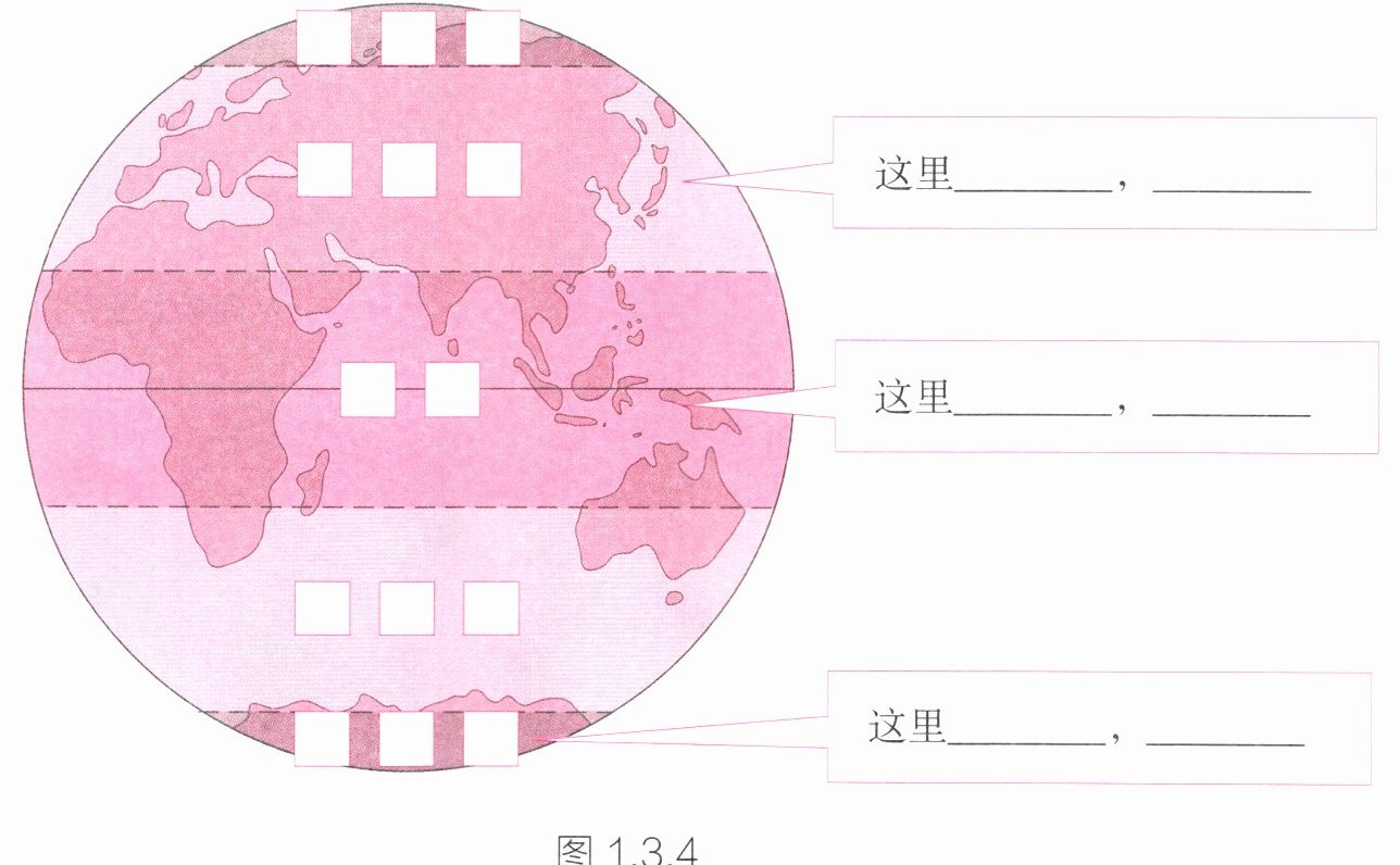 (2) 读图 1.3.4,在图中填写五带的名称,并将描述五带气候特点及现象的序号填入右侧相应的横线上。