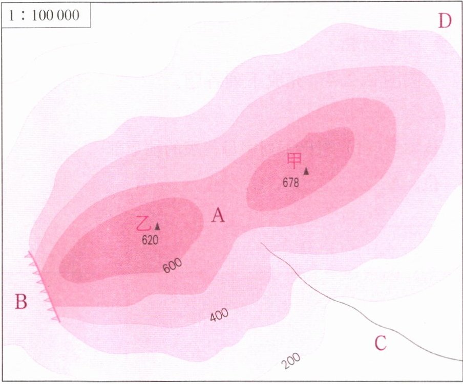 (1) 一组选择B作为起点,因为此处为陡崖,且能到达第二高峰乙;二组选择C作为起点,此处为山谷,发育河流;三组选择D作为起点,此处为山脊,能经过最高峰甲。