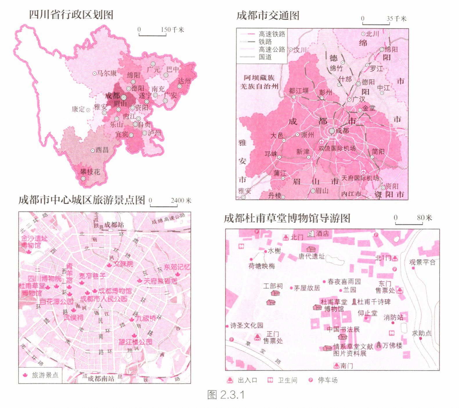 北京某同学暑期前往四川旅游,主要使用了如图 2.3.1 所示的四张地图,据图完成下列各题。