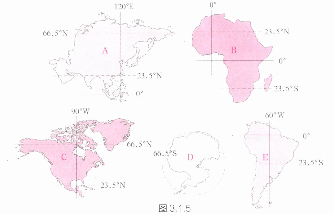 读图 3.1.5,分析归纳各大洲分布特征,并把字母填在下面的横线上。