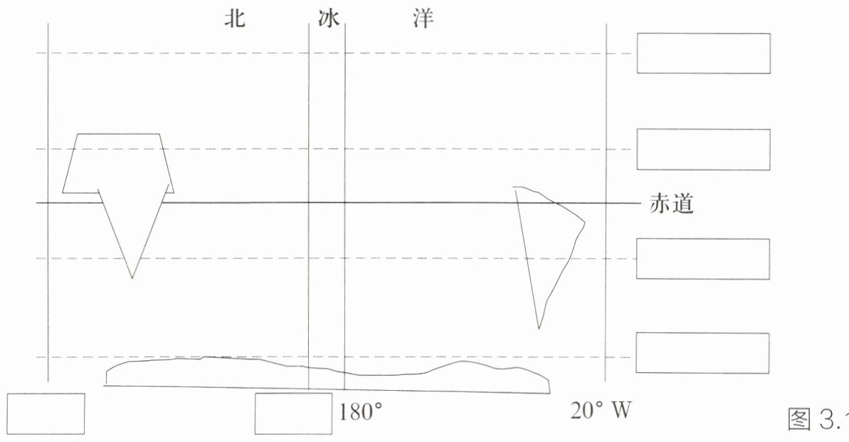 图 3.1.6 为某同学正在绘制的世界地图简笔画,观察图中已完成的各大洲地理位置、形状特点和面积大小,参考以下四点提示帮他完善此图:①补全图中重要纬线的名称及 20°W 和 160°E 经线的名称;②补充缺失大洲的轮廓;③补全七大洲、四大洋的名称;④增加其他细节,完善地图。