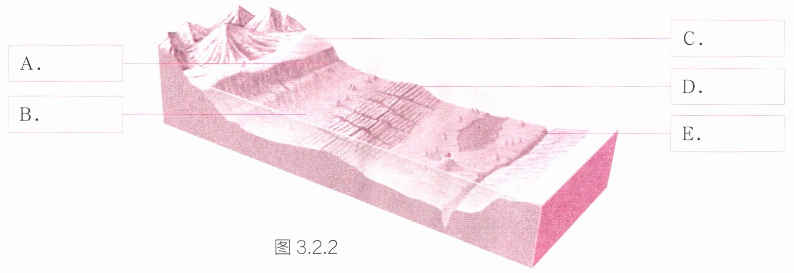 在图3.2.2中填注海底地形的名称:大陆架、大陆坡、海沟、洋盆和洋中脊。