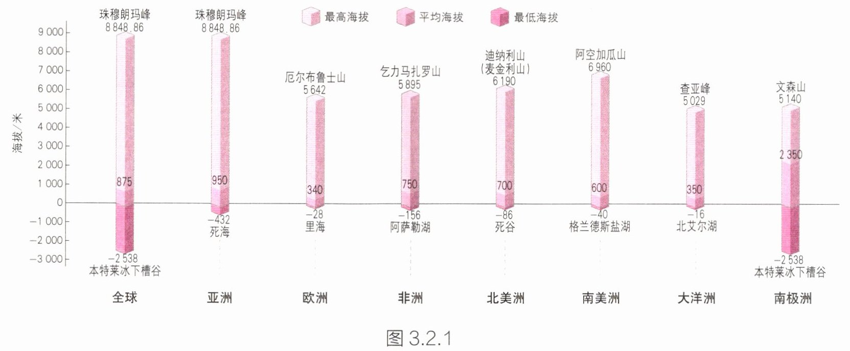 读图3.2.1,对比各大洲海拔数据,完成下列各题。