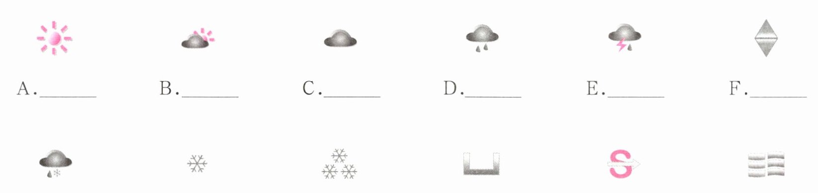 A.晴 B.多云 C.阴 D.中雨 E.雷阵雨 F.冰雹 G.雨夹雪 H.小雪 I.大雪 J.霜冻 K.沙尘暴 L.雾