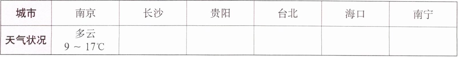 | 城市 | 南京 | 长沙 | 贵阳 | 台北 | 海口 | 南宁 |