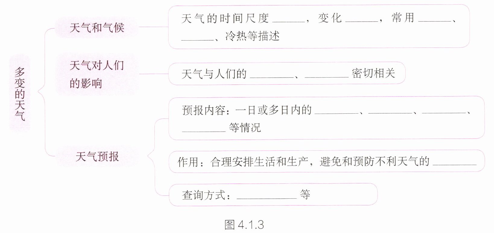 - 天气的时间尺度______,变化______,常用______、______、冷热等描述