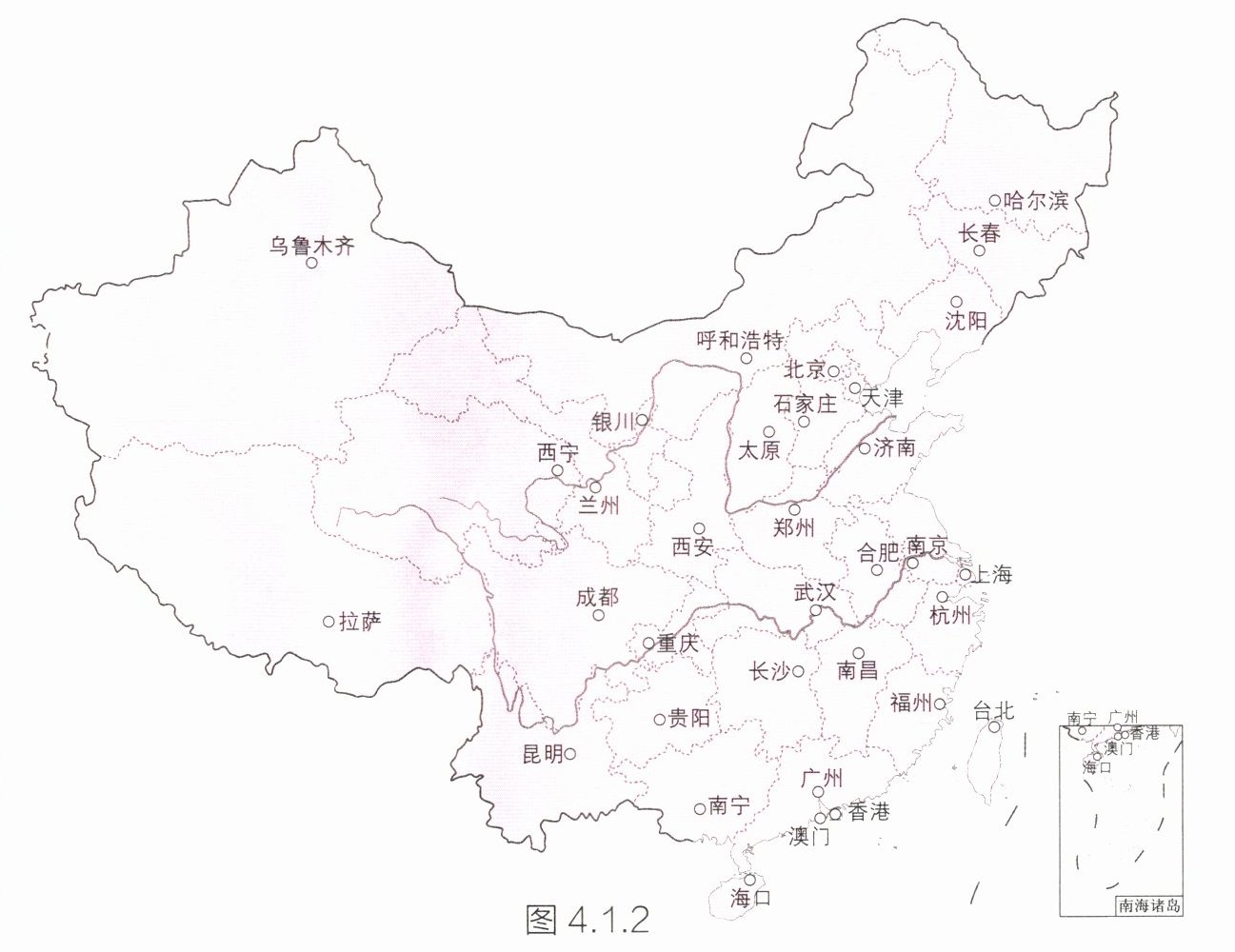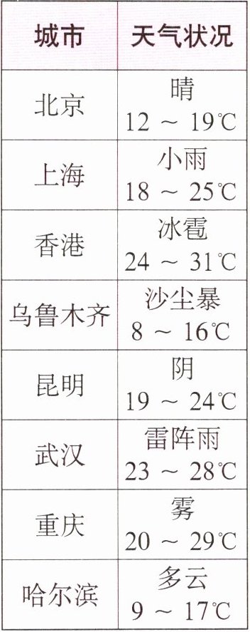 表4.1.2为我国部分城市某日的天气状况,在图4.1.2中合适的位置绘制对应的天气符号。