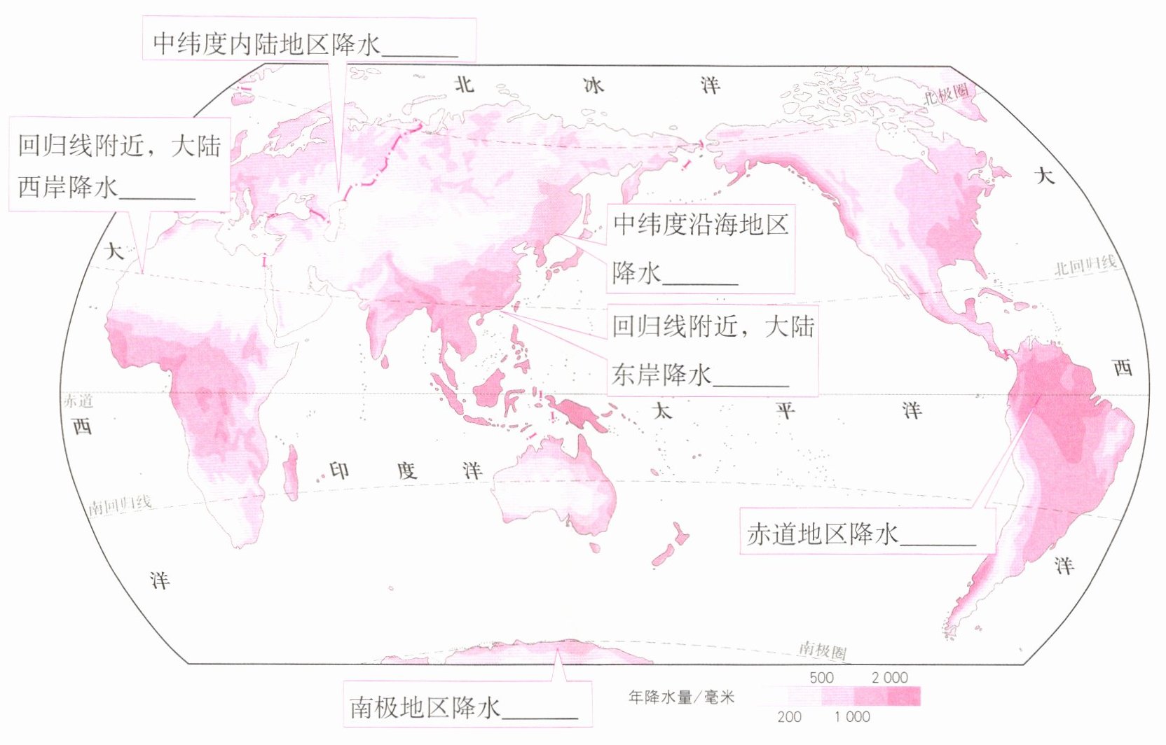 3.(1)回归线附近,大陆西岸降水:少 回归线附近,大陆东岸降水:多 中纬度沿海地区降水:多 中纬度内陆地区降水:少 赤道地区降水:多 南极地区降水:少 (2)赤道附近地区降水较多,两极地区降水较少 南、北回归线附近,大陆东岸降水较多,大陆西岸降水较少;中纬度沿海地区降水多,内陆地区降水少