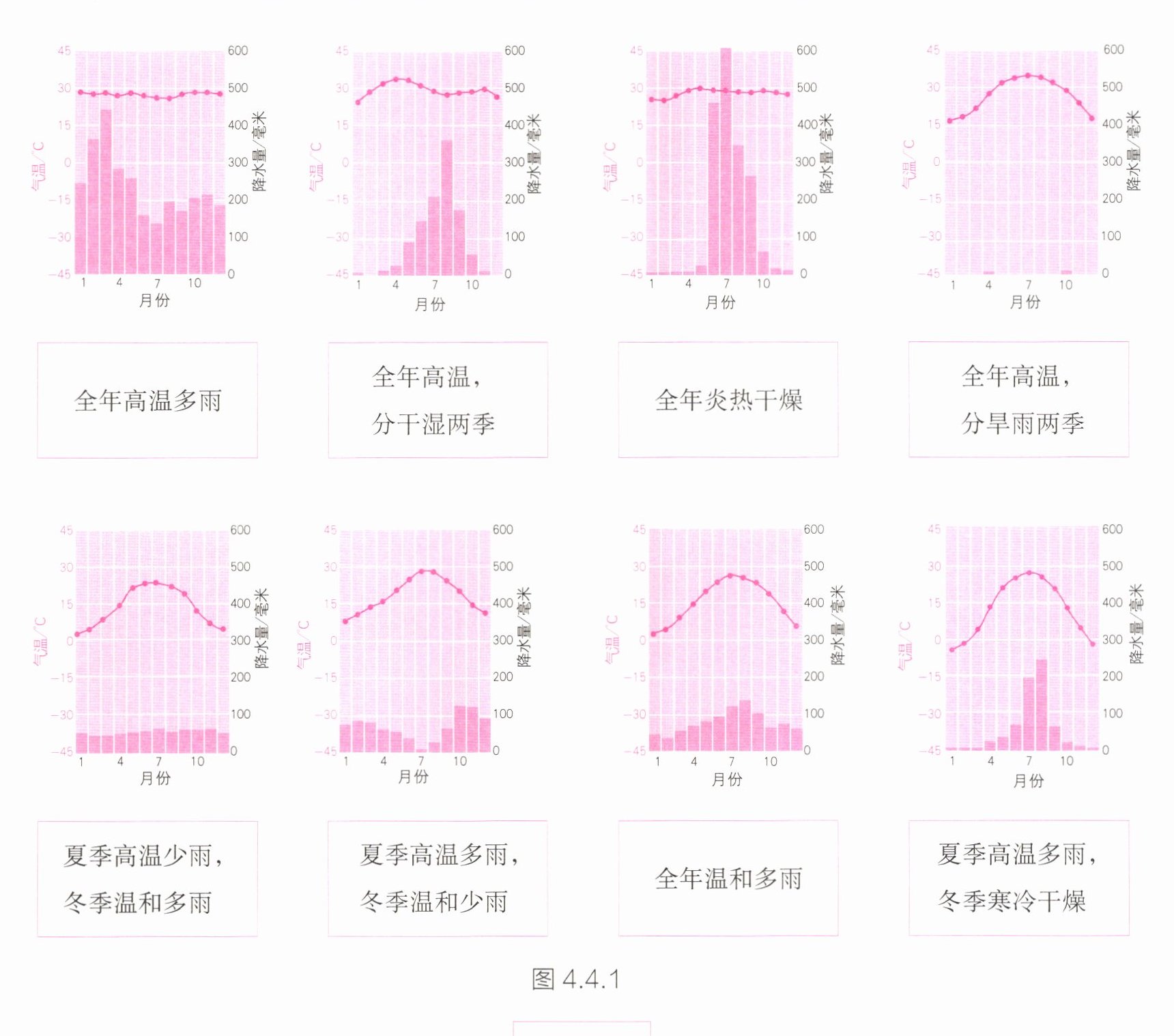 将图 4.4.1 中的气温曲线和降水量柱状图与其对应的气候特征连线。