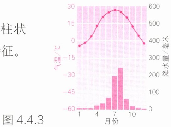 图 4.4.3 为温带季风气候区某地的气温曲线和降水量柱状图,依据此图,从气温和降水两个方面描述温带季风气候的特征。
