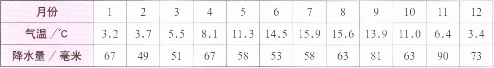 |气温/℃|3.2|3.7|5.5|8.1|11.3|14.5|15.9|15.6|13.9|11.0|6.4|3.4|