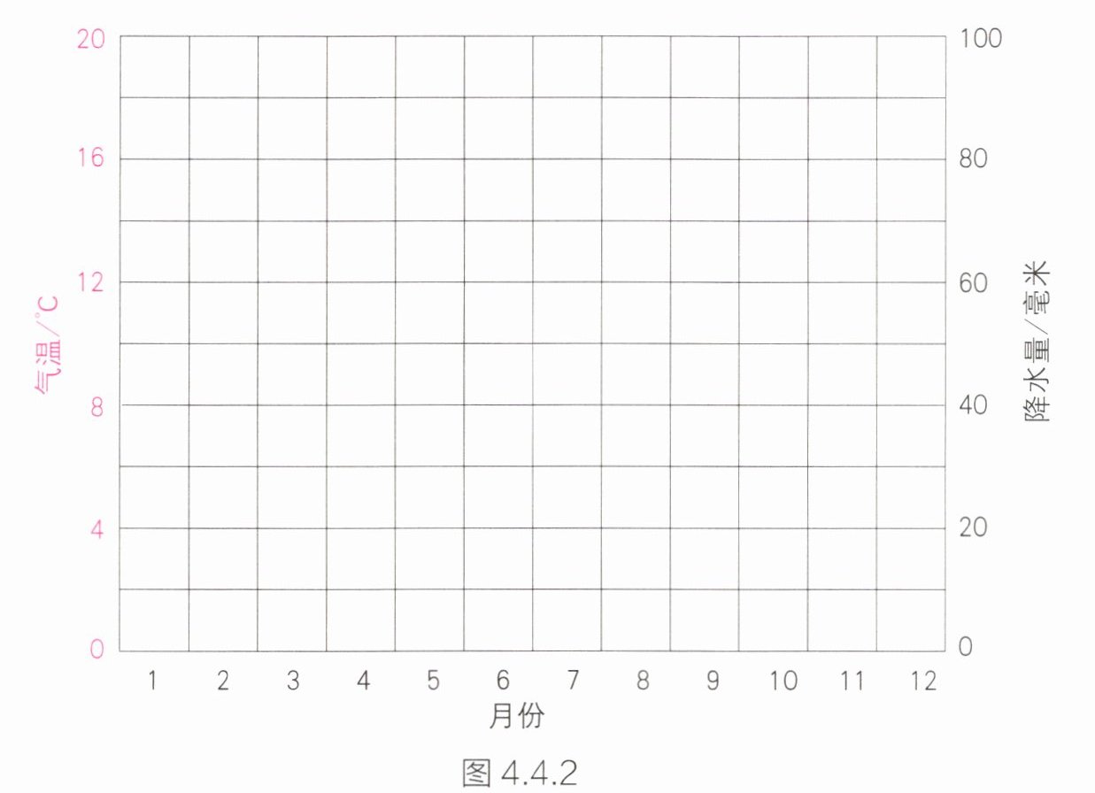 (1)根据表 4.4.1 中的甲地气候资料,在图 4.4.2 中绘出甲地的气温曲线和降水量柱状图。
