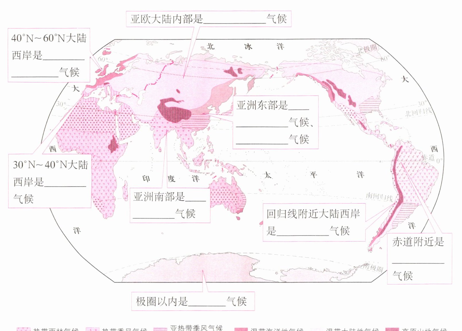 (2)亚欧大陆内部是温带大陆性气候 40°N~60°N大陆西岸是温带海洋性气候 30°N~40°N大陆西岸是地中海气候 回归线附近大陆西岸是热带沙漠气候 亚洲东部是亚热带季风气候和湿润气候、温带季风气候 亚洲南部是热带季风气候 极圈以内是寒带气候 赤道附近是热带雨林气候