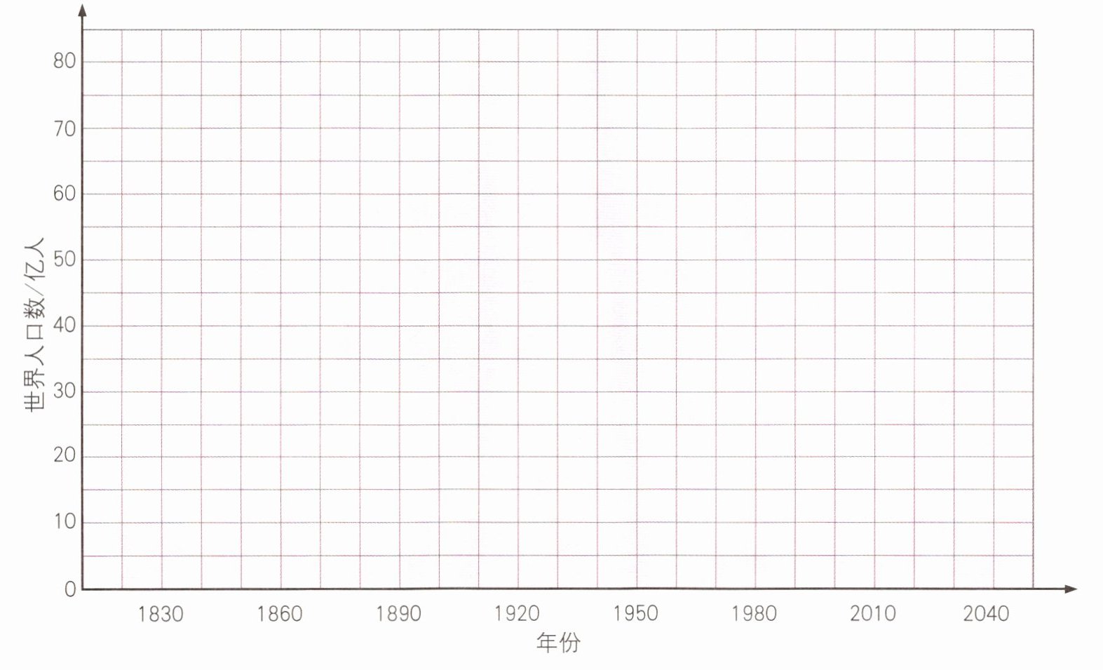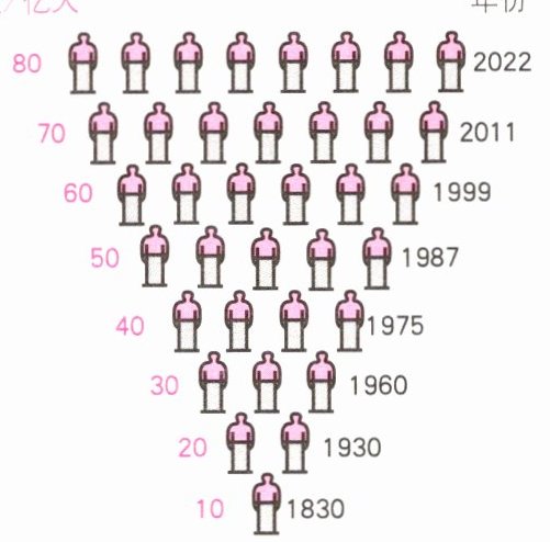 |从 40 亿到 50 亿| |$\multirow{3}{*}{\makecell{人口每增长 10 亿所经历的时间\\$______$;人口增长速度$______$}}$|