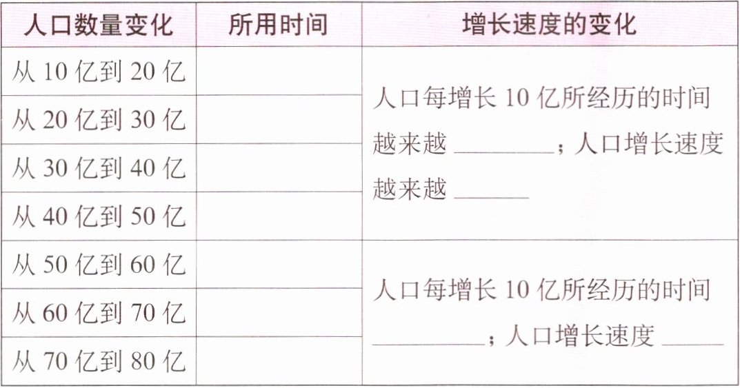 |从 10 亿到 20 亿| |$\multirow{3}{*}{\makecell{人口每增长 10 亿所经历的时间\\越来越$______$;人口增长速度\\越来越$______$}}$|