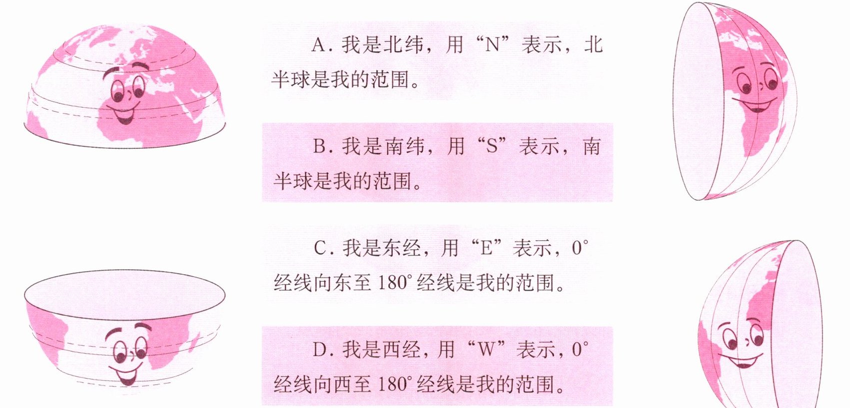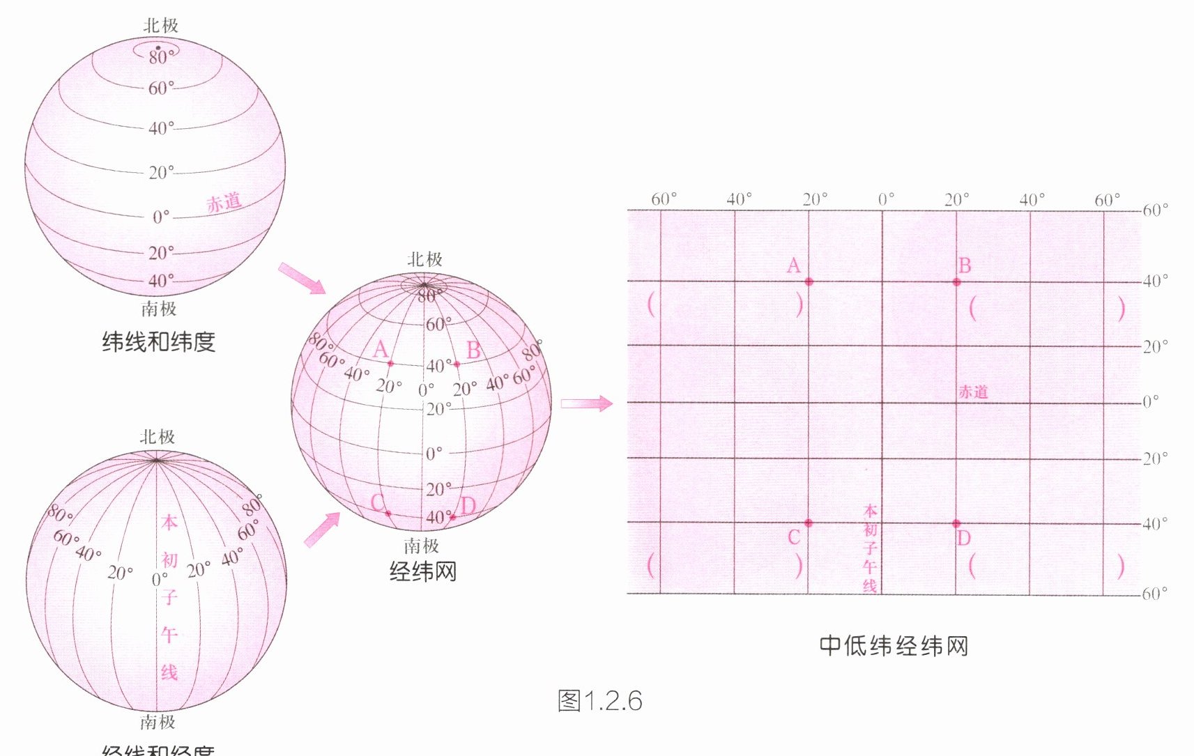 根据图 1.2.6 中经纬网上点的位置辨析经纬度。