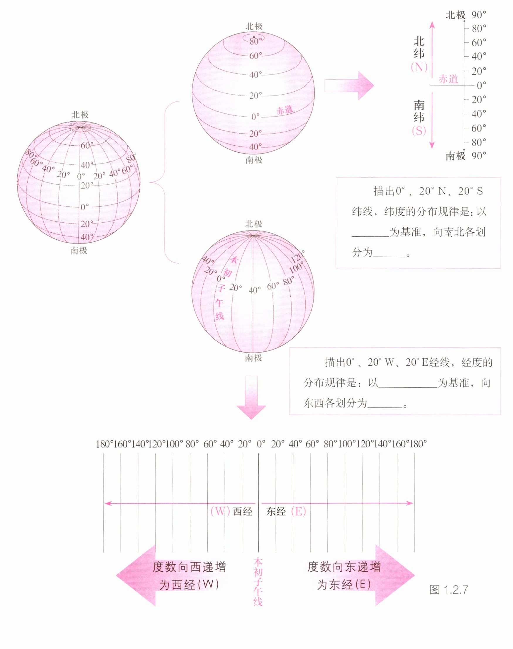 读图 1.2.7,按要求描绘经纬线,归纳经度和纬度的分布规律。