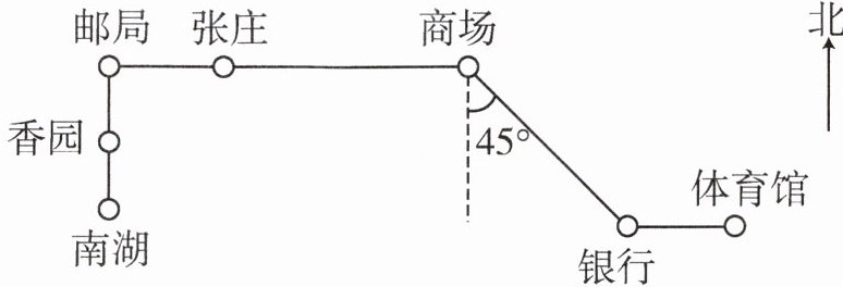 )站到南湖。(2)从张庄到体育馆的行驶路线:向(