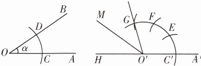 5. 如图,$ \angle AOB = \alpha $,以 $ O $ 为圆心,任意长为半径画弧,分别交 $ OA $,$ OB $ 于点 $ C $,$ D $;画射线 $ O'A' $,以点 $ O' $ 为圆心,$ OC $ 长为半径画弧交 $ O'A' $ 于点 $ C' $;依次截取 $ C'E = EF = FG = CD $,分别交前弧于点 $ E $,$ F $,$ G $;画射线 $ O'G $,反向延长 $ O'A' $ 至点 $ H $;画出 $ \angle HO'G $ 的平分线 $ O'M $.则 $ \angle MO'H = $