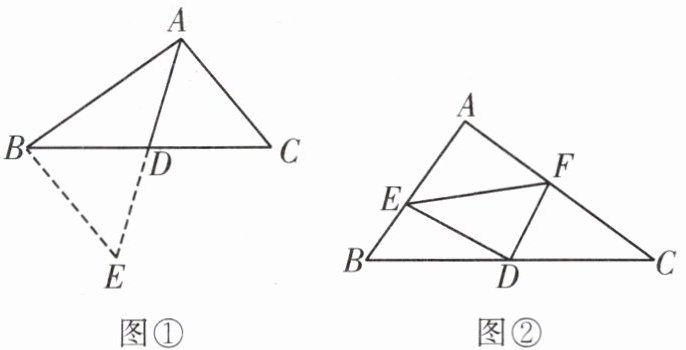 【灵活运用】(3)如图②,在 $\triangle ABC$ 中,$D$ 是 $BC$ 的中点,$DE \perp DF$,$DE$ 交 $AB$ 于点 $E$,$DF$ 交 $AC$ 于点 $F$,连接 $EF$。求证:$BE + CF > EF$。