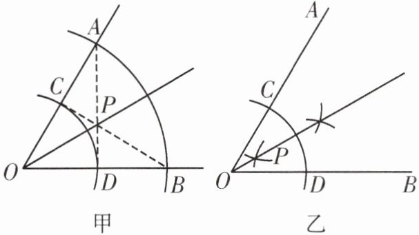 7. 某班开展“用直尺和圆规作角平分线”的探究活动,甲、乙两个同学展示作图痕迹如图所示,其中射线$OP为\angle AOB$平分线的是(