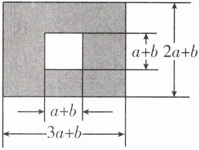 解 $S_{阴影}=(3a+b)(2a+b)-(a+b)^{2}=6a^{2}+3ab+2ab+b^{2}-a^{2}-2ab-b^{2}=5a^{2}+3ab.$所以绿化的面积是$(5a^{2}+3ab)\ m^2$.当$a=3$,$b=2$时,$5a^{2}+3ab=5×9+3×3×2=45+18=63.$所以当$a=3$,$b=2$时的绿化面积为$63\ m^2$.