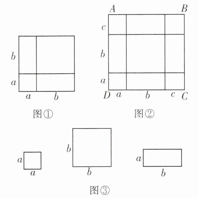 【问题解决】如图②,将边长为$a + b + c的正方形ABCD$分割成几个小正方形与小长方形。