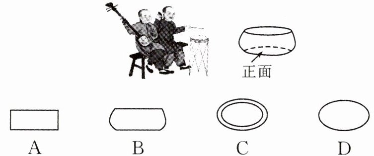 11. 新情境 传统文化 (辽阳期末) 国家级非物质文化遗产之一的东北大鼓是中国北方曲种,流行于辽宁、吉林、黑龙江 3 省,一度盛行于沈阳,故又称奉天大鼓、奉派大鼓、奉调大鼓、辽宁大鼓. 如图是表演情景及乐器之一鼓的立体图形,该立体图形的主视图是(