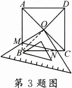 3. 如图,将一块含 $ 45^{\circ} $ 角的直角三角尺的直角顶点与正方形 $ ABCD $ 的对角线 $ AC,BD $ 的交点 $ O $ 重合,两条直角边分别与 $ AB $ 边和 $ BC $ 边交于点 $ M,N $,连接 $ MN $,若 $ AM = 4,CN = 1 $,则 $ MN = $