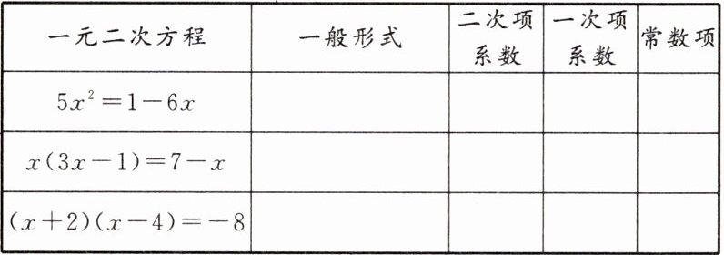 $5x^{2}+6x-1=0$ 5 6 -1$3x^{2}-7=0$ 3 0 -7$x^{2}-2x=0$ 1 -2 0