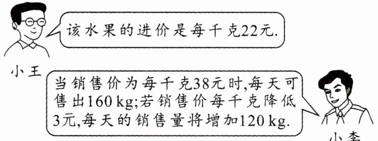(1)设这种水果的销售价应为每千克x元,由题意,得(x-22)(160+120·38-x/3)=3640,整理,得x²-64x+1015=0,解得x₁=35,x₂=29.