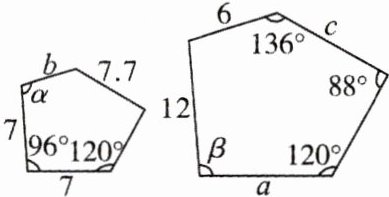 7.(7 分)如图所示的两个五边形相似,根据图中标注数据求 $ a $,$ b $,$ c $ 的值以及 $ \angle \alpha $ 和 $ \angle \beta $ 的度数。