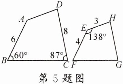 5.(4 分)如图,四边形 $ ABCD \backsim $ 四边形 $ EFGH $,则 $ \angle G = $