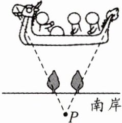 11. 新情境 传统文化 如图,一条河的两岸是平行的,在河的南岸岸边每隔 $ 5 \, m $ 有一棵树,小华站在离南岸 $ 20 \, m $ 的点 $ P $ 处看北岸,在相邻的两棵树之间的空隙中恰好看见一条龙舟的龙头和龙尾 (龙头、龙尾和小华的眼睛位于同一水平平面内),已知龙舟的长为 $ 18.5 \, m $,若龙舟行驶在河的中心,且龙舟与河岸平行,则河的宽度为