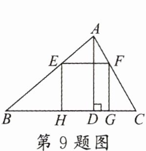 9. (沈阳和平区期末) 如图,在 $ \triangle ABC $ 中,边 $ BC = 60 $,高 $ AD = 40 $,正方形 $ EFGH $ 的顶点 $ E $,$ F $ 分别在边 $ AB $ 和 $ AC $ 上,边 $ GH $ 在 $ BC $ 上,则这个正方形的边长为(