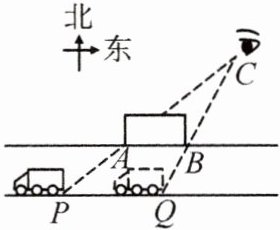 12. (14 分) 新情境 生产生活 某天,小芳走到如图所示的 $ C $ 处时,看到正对面一条东西走向的笔直公路上有一辆汽车从东面驶来,到达 $ Q $ 处时恰好被公路北侧边上竖着的一个长 $ 12 \, m $ 的广告牌 $ AB $ 挡住,$ 3 \, s $ 后在 $ P $ 处又重新看到该汽车的全部车身。已知该汽车的行驶速度是 $ 6 \, m/s $,假设 $ AB // PQ $,公路宽为 $ 10 \, m $,求小芳所在 $ C $ 处到公路南侧 $ PQ $ 的距离。
