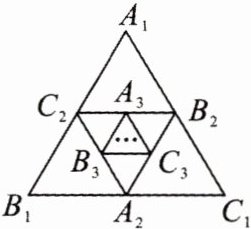 14. (6 分)思想方法 类比思想如图,小思作出了边长为 1 的第 1 个等边三角形$A_1B_1C_1$,然后分别取$\triangle A_1B_1C_1三边的中点A_2$,$B_2$,$C_2$,作出了第 2 个等边三角形$A_2B_2C_2$,用同样的方法作出了第 3 个等边三角形$A_3B_3C_3$.