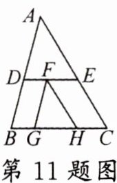 11. 如图,在$\triangle ABC$中,$D$,$E两点分别在AB$,$AC$上,点$F在DE$上,$G$,$H两点在BC$上,且$DE // BC$,$FG // AB$,$FH // AC$,若$BG:GH:HC = 4:6:5$,则$\triangle ADE与\triangle FGH$的面积比为