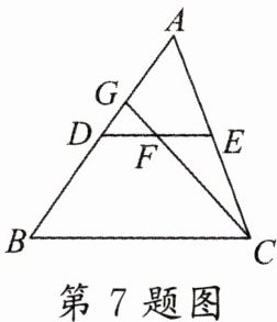 7. 如图,$DE是△ABC$的中位线,$F是DE$的中点,$CF的延长线交AB于点G$,若$△CEF的面积为18\ cm^2$,则$S_{△DGF}= $