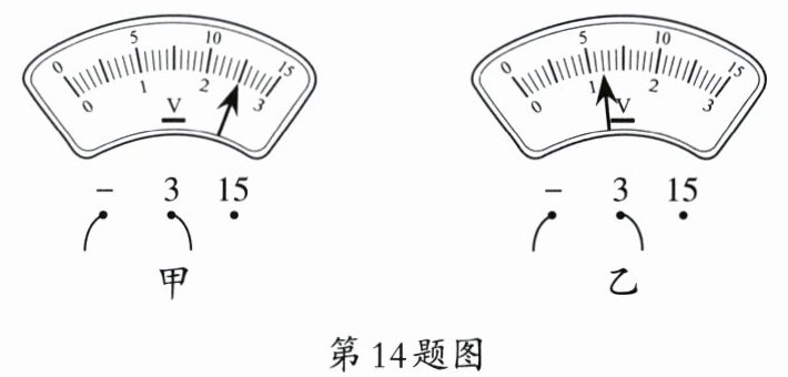 14. 在一次测量 $ L_{1} $、$ L_{2} $ 灯串联的电路电压的实验中,电路两端的总电压值如图甲所示,则总电压为