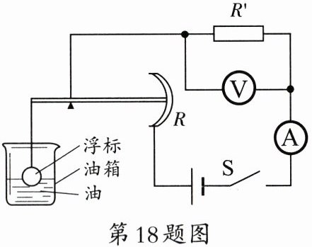 18. 如图所示是一种自动测定油箱内油面高度的装置,$ R $ 是滑动变阻器,它的金属杆是杠杆的一端,从油量表(由电流表改装而成)指针所指的刻度,就可以知道油箱内油面的高度。当滑动变阻器的金属杆上移时,油箱内油面
