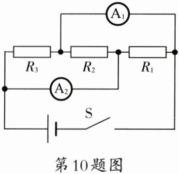 10. 如图所示,电源电压恒定且$U= 12V,R_1= 12Ω,R_2= 6Ω,R_3= 4Ω,$闭合开关S后,电流表$A_1$和$A_2$的示数分别为(