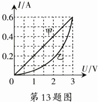 13. 在某一温度下,两个电路元件甲和乙中的电流与电压的关系如图所示。由图可知,元件甲的电阻是